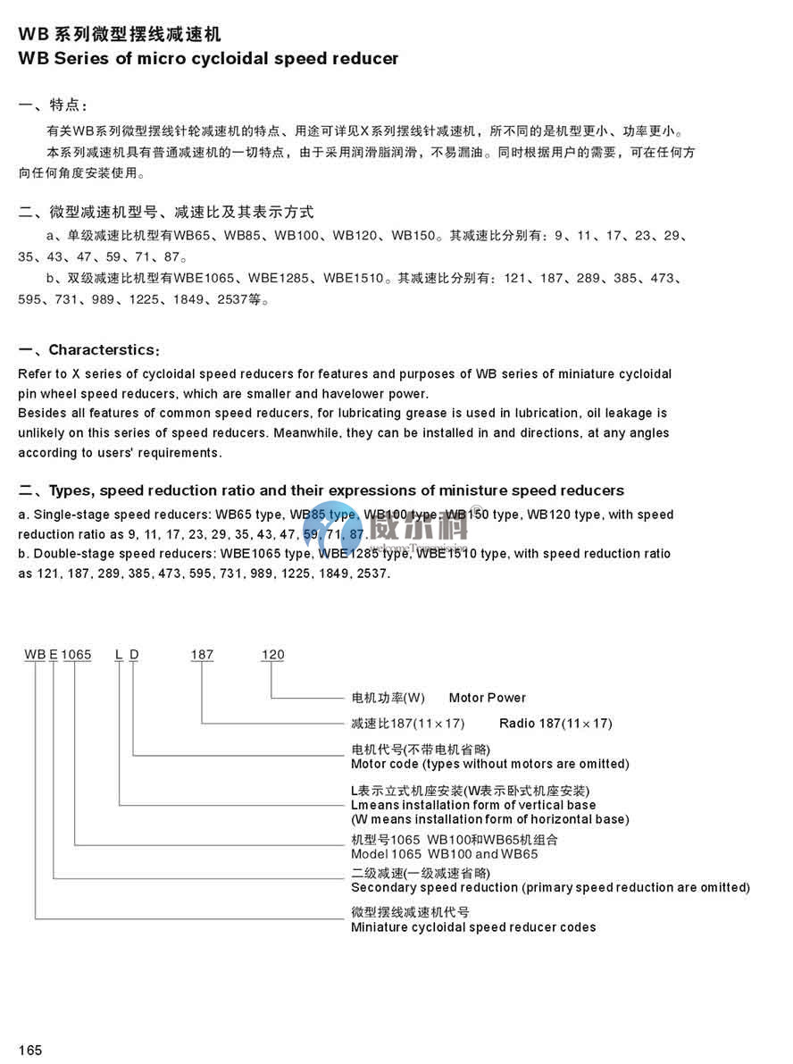 1、單級減速機速比機型有WB65型、WB85型、WB100型、WB120型、WB150型;